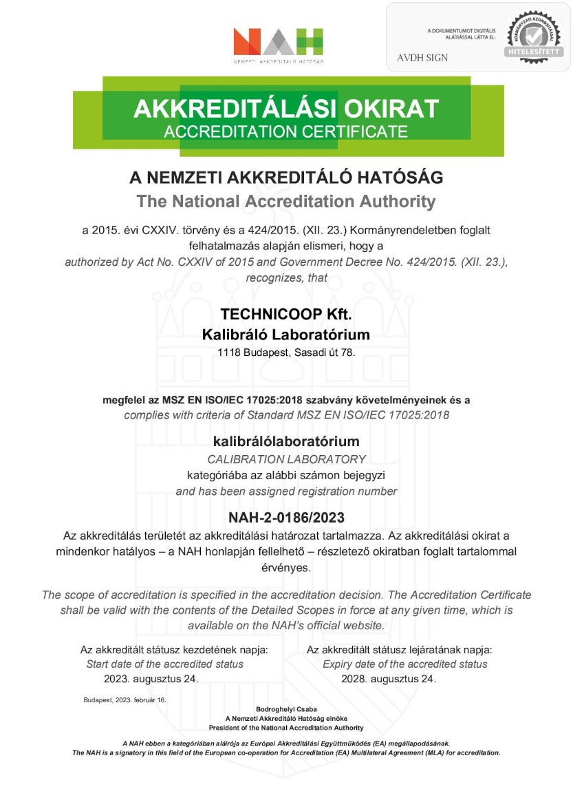 Our calibration laboratory has maintained its accreditation since 1993. The laboratory is accredited by the National Accreditation Authority (NAH) in accordance with the MSZ EN ISO/IEC 17025:2018 standard.